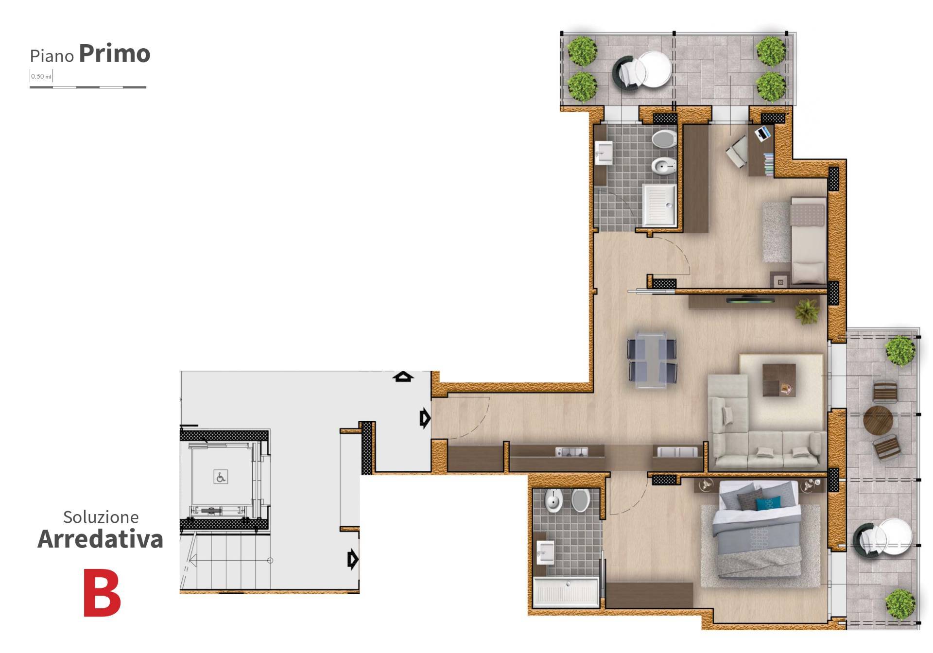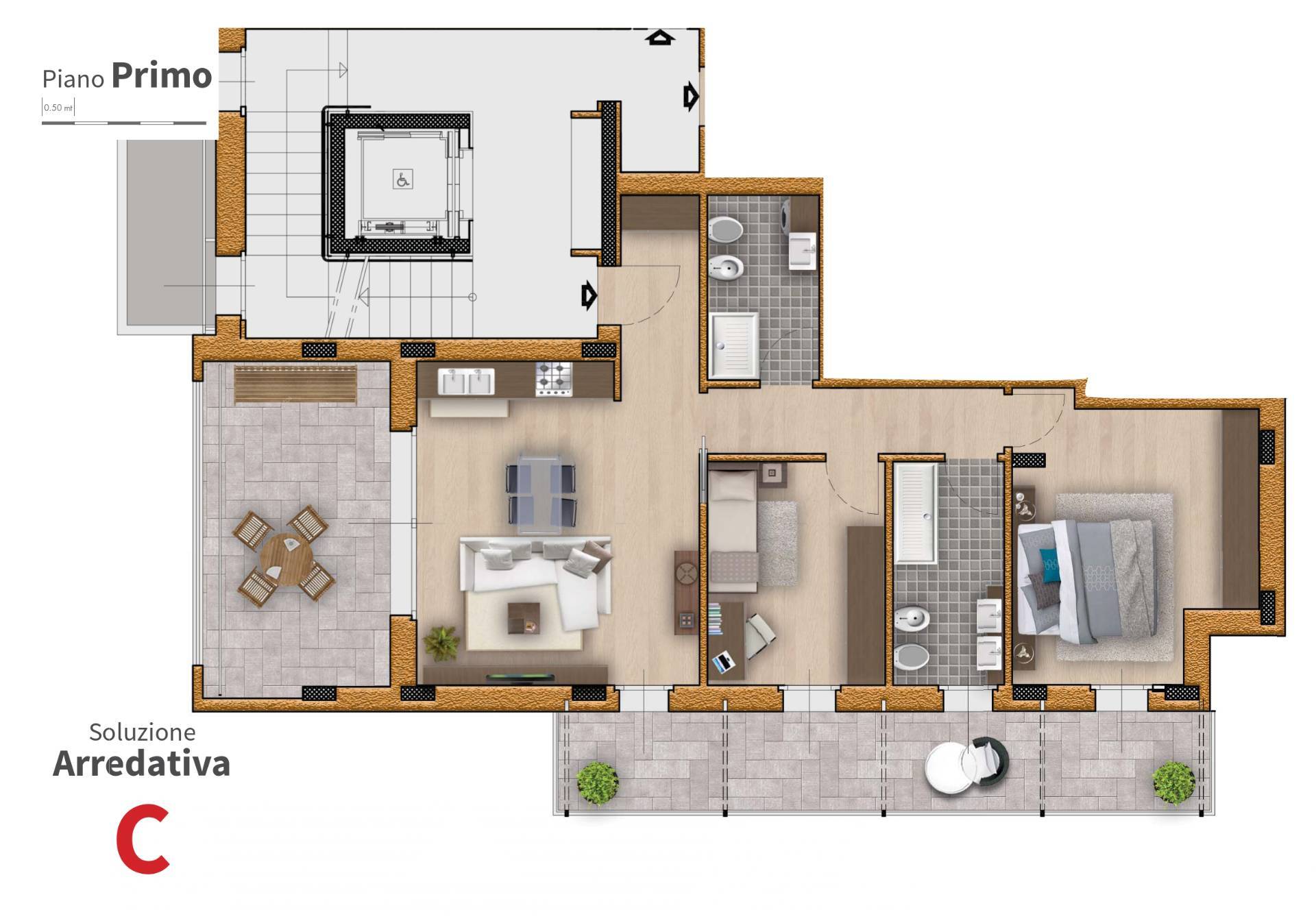 - Attici con grandi terrazze: con vetrate ampie e luminosissime, offrono una vista panoramica a 360 gradi sulle splendide colline del Parco dei Colli.